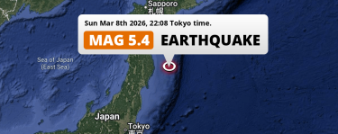 On Sunday Evening a Shallow M5.4 FORESHOCK struck in the North Pacific Ocean 178km from Morioka (Japan).